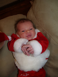 Elissa is quite a content baby. She has sweet chubby cheeks now and is sleeping in longer increments at night. She is mesmerized by the Christmas tree lights when we rock in the nearby chair. And yesterday as you see by the above picture I dressed her up in her new Santa outfit and put her in Hunter’s stocking. While I thought it was adorable, she was not thrilled.