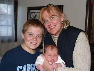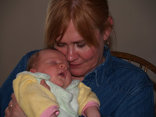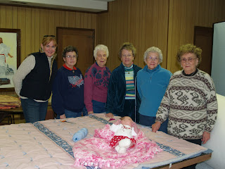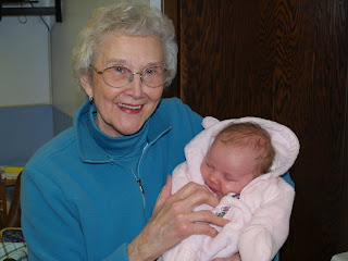 Elizabeth getting comfortable at quilting with the Lutheran ladies…Mama Jane on the far left and I brought Elissa for a visit to Great-Grandma Nola’s weekly quilting time at the church. The ladies were very anxious to meet Elissa and thrilled with our surprise visit to them. Mama Jane brought Elissa and me home to Wishek today after our visit to the farm. Hunter was happy to have his mommy and baby sister home…and Elissa was tired from her travels. Tonight Nathan is rocking Elissa to sleep and enjoying every minute of it. Nathan and Hunter had not seen Elissa since Sunday night when they left the farm and they are sure she has grown…especially in her chubby cheeks!