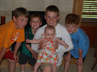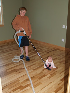Look at me! I’m 6 months old today and very excited because my daddy and grandpa installed wood floor (and some base board) in our house this weekend. Helping my brother vacuum It is summertime so I don’t go to Ora’s house anymore but here is a pic of Ora holding all of us including my two friends that are sisters–Camden and Kaia. Mommy took me to my first wedding this weekend. And Hunter took our picture. We zipped to Fargo for our friend RaeAnn’s wedding. Hunter stayed to play with his buddies, Christian, Parker and Noah while Mommy and I went to the wedding. Christian, Noah and Parker’s mommy and daddy stayed with me a few hours after the wedding so Mommy could to the wedding reception. I was beat and ready for bed. Weddings wear me out.