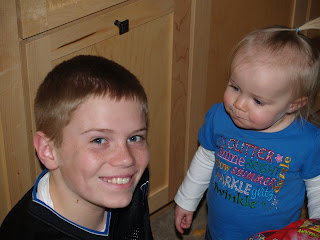 Hunter is becoming very good at cleaning up after his sister.