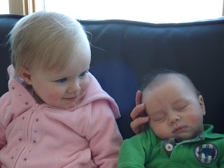 Elizabeth is enthralled with babies these days so visiting with Ethan was a treat. She says BABY all the time. She has a baby doll that she puts to bed each time she naps or goes to bed at night. Baby has a new bed that magically arrived via Ebay (need to blog about this in a different post…but all I can say I now LOVE EBAY and love deals…my mom laughs at me since I mocked her Ebaying for years) We tell Elissa there is a baby in my tummy. Yesterday though I was wearing a shirt with cherries on it and she just kept pointing to my tummy saying “Apple”. But many times she puts her mouth next to my tummy and says “Hi” and then points again and says “Baby!”