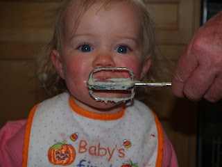 Note the bib change from the below pic to the above pic. My mom couldn’t have her granddaughter wearing a “Baby’s First Halloween” bib on a Holy holiday like Easter. She magically disappeared to her sewing room and reappeared from her stash with a handmade bib with floral fabric and pink ribbon. More Easter appropriate!