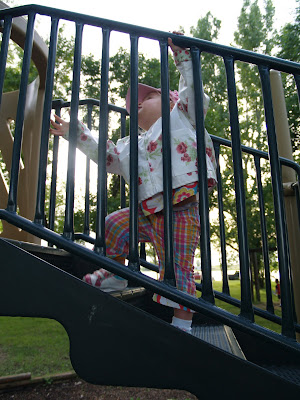 Elizabeth is all about being a big girl at the park, climbing the stairs and going down the slide by herself. Although we as parents are still a little nervous since her leg breaking incident on the slide. She is full of confidence!