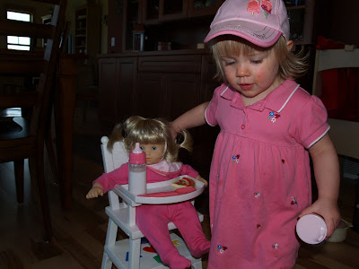 When Elissa is not playing outside, reading books or sleeping, her love is playing with Baby. The magical world of Ebay has delivered a high chair, stroller and wicker suitcase for Miss Baby this week and the items have already created hours of play for Elissa.