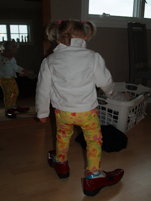 After Anika was born, Auntie Lori went shopping and sent us a box of newborn clothes for Anika. In addition to the gifts for Anika there was a pair of my favorite brand of shoes–in red patent leather. Paul Green’s. (The ABSOLUTE most comfortable shoe I have found. They are worth spending $$$ on and having less shoes!) They were new and didn’t fit Auntie Lori. So sad for her, so happy for me. Before I could try them on, who found them? Busy Bits. With her Stride Rite shoes she slipped right into them and wore them around for days. So sad for me, they were too snug but thankfully found a happy home with my mom. Busy Bits has found her love for shoes and even Paul Green’s. She organizes her shoes already into the little shoe slots in her closet system. Not all the slots are full though and she says to me often “Moh shoes, moh shoes Mama!”