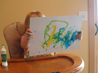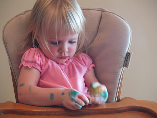At 8AM this morning, we dropped off Hunter with his back pack, basketball bag and trumpet at school. He will be taking the bus to his game after school and we will drive to watch. After the school drop off, the girls and I went to the flower shop, grocery store and stopped at the lumber yard. By 9AM we were home and E needed some entertainment. On beautiful days like today, we spend as much time as possible outside in the mornings. Walks, playing at the park, playing house on the porch, etc. But this morning I needed to feed Anika, drink some coffee, put away groceries and organize to make something in the crock-pot so we can eat dinner after we get home from Hunter’s game. Elissa’s entertainment for that time this morning was painting in her high chair.