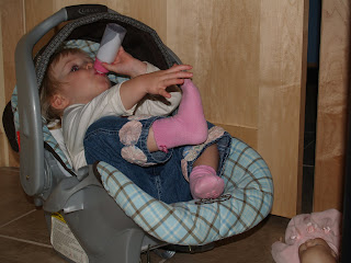 Miss E has not had trouble adjusting to life as a big sister. She just wants to make sure she is first to do something. Her latest word is just that…”fuhst” as in “first”. She proclaims to Anika, “No no! Mine fuhst!” and proceeds to take over. She gets the first turn at anything. Always. If we let her. The first above picture is NOT a bottle of Anika’s. It is E’s travel baby’s bottle and she is pretending to be a baby in Anika’s infant seat.