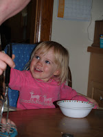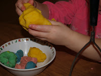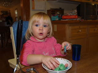 We brought the play dough home with us when we left the farm last weekend. Last night when I called home to talk to Nathan and the kids. E promptly told “Me pay my pay dough Mommy!” and Nathan said yet again she was in her high chair playing play dough.