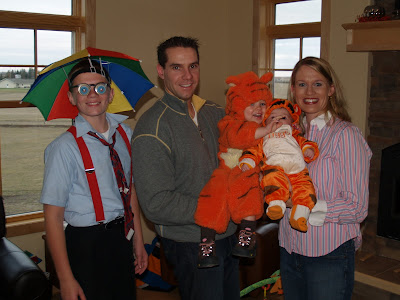 We had a Halloween Saturday night that included twin Tiggers and a nerd in our family. Hunter James was Tigger for three years, from ages 1-3. He wore the costume when it was too big, fit just right and too small. It was his favorite. It is a cozy costume for trick or treating on the prairie. Through our many moves, I saved the costume. And if my scanner was properly installed into my computer right now I would show how cute Hunter was as Tigger over a decade ago. But instead you get to see him as a nerd at age twelve and Miss E taking over the honor of the Tigger costume.