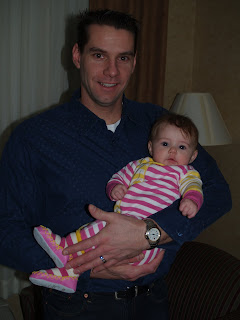 On Friday evening, Nathan was the guest speaker at a local college’s winter commencement ceremonies. He was asked to speak by a former employee and our friend Aimee. She asked Nathan to speak about going from working in corporate America to owning a small business in rural North Dakota, a topic he knows well. Nathan talked on his career change as well as recognizing turning points in your life and how you respond to change defines you. I was a very proud wife and Anika was a very proud (and well behaved…of course) daughter. The above picture was Saturday morning as Anika snuggled with her daddy before we left our hotel room to begin the next leg of our road trip. I had to take the picture because Anika was sporting her own slippers that matched her jammies which I find to be over-the-top adorable and cozy. And you can see in the picture how Anika looks like her daddy more and more every day.