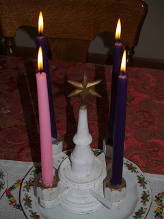 Today all of us went to church together. The fourth Advent candle was lit which caused Elizabeth to exclaim “day yightd da pink one!” (they lighted the pink one). Grandpa’s father, Oscar Sr. made the advent candle holder that is on my mom’s table in the above picture as well as the one at our family’s church in Aneta.