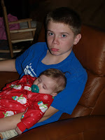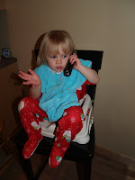 It is starting to look a lot like Christmas at our house this week. The girls have matching red snowman jammies, courtesy of Mama Jane and our UPS delivery driver. Although Elissa insists she wants a pink snowman along with the pink Christmas tree she has already ordered from Santa and sings a few words from Frosty the Snowman. I am not sure where she wants the pink snowman to go but she thinks it is a good idea. Hunter has a sad face in the above picture because he was holding Anika for me last night as she had a bout of a yucky bug or upset stomach of some sort. Thankfully after a lot of puking, she is back to her smiling self today and eating well. Miss E after her snack last night stayed put in her chair to talk to Auntie Kirsti on the phone.