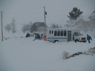 Today after school I received a call from my dear wife that the city school bus (which has run for now 3 days) is stuck in our driveway before even reaching the house. I quickly responded with the Bobcat to move some of the snow off of the road and then my father came in behind me with his pickup and pulled the bus out of the pile it had driven into.