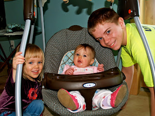 There is no question Anika gets plenty of love and attention from her big sister and big brother. She is the apple of their eye. Yesterday afternoon, Anika sat next to me in her exersaucer which we fondly call the “command center”, right next to the play kitchen. E made pretend food for her in the kitchen and then was feeding her the pretend food. It worked for awhile until Anika realized her sister was actually never going to feed her and she was going to get pretend empty spoonfuls every time. Hunter loves playing with Anika, particularly because she doesn’t declare him the puppy every time they play like his other sister does.