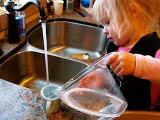 Last night Hunter (after recovering from very nasty stomach flu so he has not been photographed for a few days) went to a local basketball practice with Nathan in a nearby town. The girls and I were at home for supper together. As I talked to my sister in law, Lori, on the phone, Elizabeth was “helping” me with the dishes…and pouring water on the counter. That was “coffee” she said.