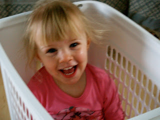 This is the Elmo dishwasher culprit, playing in a laundry hamper with her new horse “Sheyenne” (named after Boppa Fred’s horse of course). Sheyenne was a recent gift from Nana and Gpa Eldon. She is perfect for Miss E because she is PINK. And according to Elizabeth, the whole world should be pink. She tells Hunter every morning he should get a pink bus to ride on for school. And she is going to get a pink bus…when she is five or so she says.