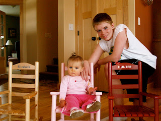 I thought it would adorable if I could get the kids around each of their personalized rocking chairs today. Anika cooperated. Hunter cooperated…by kneeling behind his chair and not breaking it.