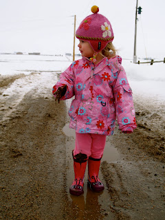 The snow is melting on the prairie. It is a slow thaw which is ideal to prevent spring flooding but it is a time that we long for sunshine (which we haven’t seen it what seems like months), green grass and no mud. Frosty fell over and every day Miss E needs to go out to “see where Frosty was” which is really just her excuse to slop in the mud.
