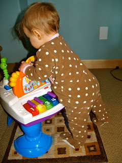 She was sick herself but showed us how she can stand strong by pulling herself up numerous times on different things. I just finally ran to get the camera to document it so we wouldn’t forget. Her favorite is the little piano because her sister taught her to play it. Although Elissa says “Anika you like MY piano?”
