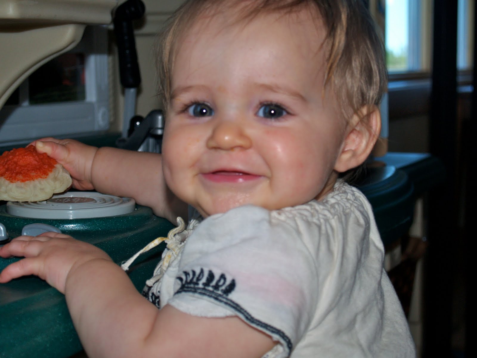 I absolutely love how Anika has started to interact and play on her own. Last night I enjoyed just sitting with her, playing along with her “cooking”. When Santa delivered the kitchen to our house last Christmas for the girls, I didn’t realize how quickly it would become a toy and place of pure entertainment for Anika. It is a place where her sister is learning to share, a challenging but valuable lesson for a headstrong two year old. The kitchen is for both of the girls to play with and maybe the reason Anika was especially smiley last night was that she had it all to herself!