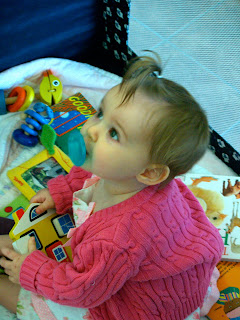She was not overly excited to play with hop hop this month and left him behind to go play with things she can now get to…like her sister’s toys.