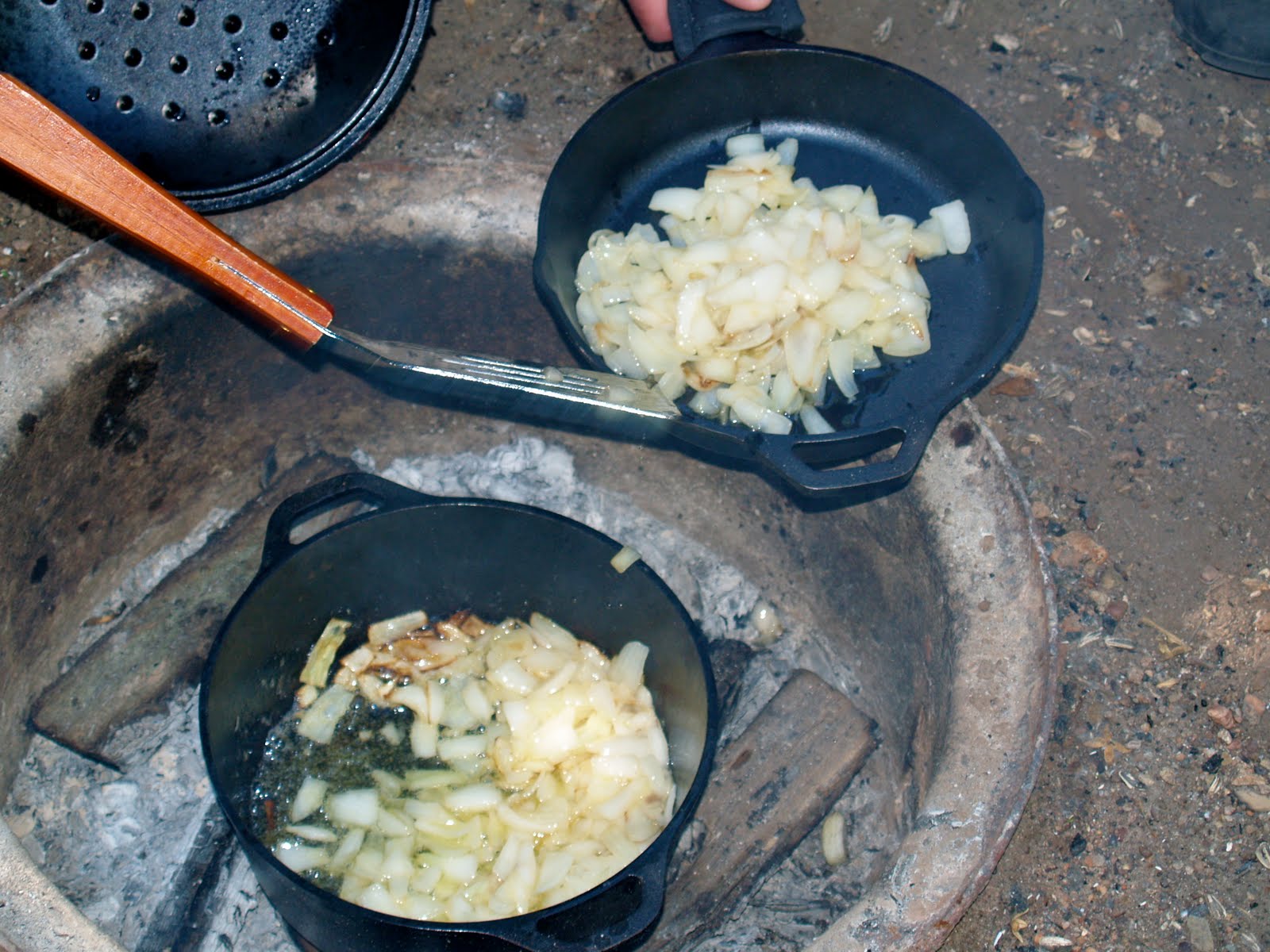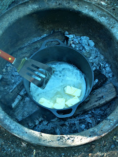 Follow Pioneer Woman’s recipes only everything is over the camp fire. Do not forego the important step of use “lots of butter”. Yes lots of it.