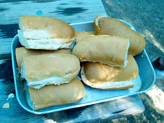 Our one and only local grocery store makes sub bread on a daily basis. I cut it in half, butter and toast for the bread. Except this time, we didn’t toast the bread. Do what you need to do when camping.