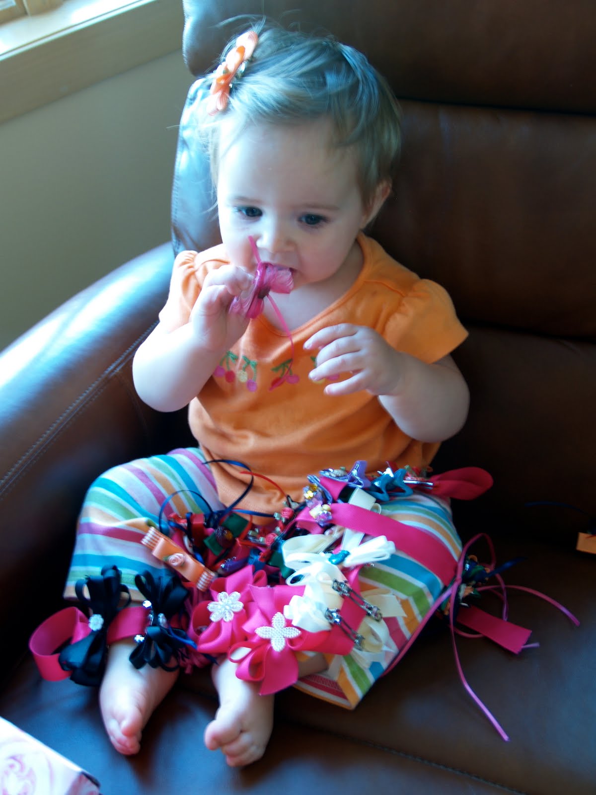 Anika was able to enjoy her share of the hair bows too. She tasted them as well as allowed an orange bow in her hair that she didn’t rip out and eat.