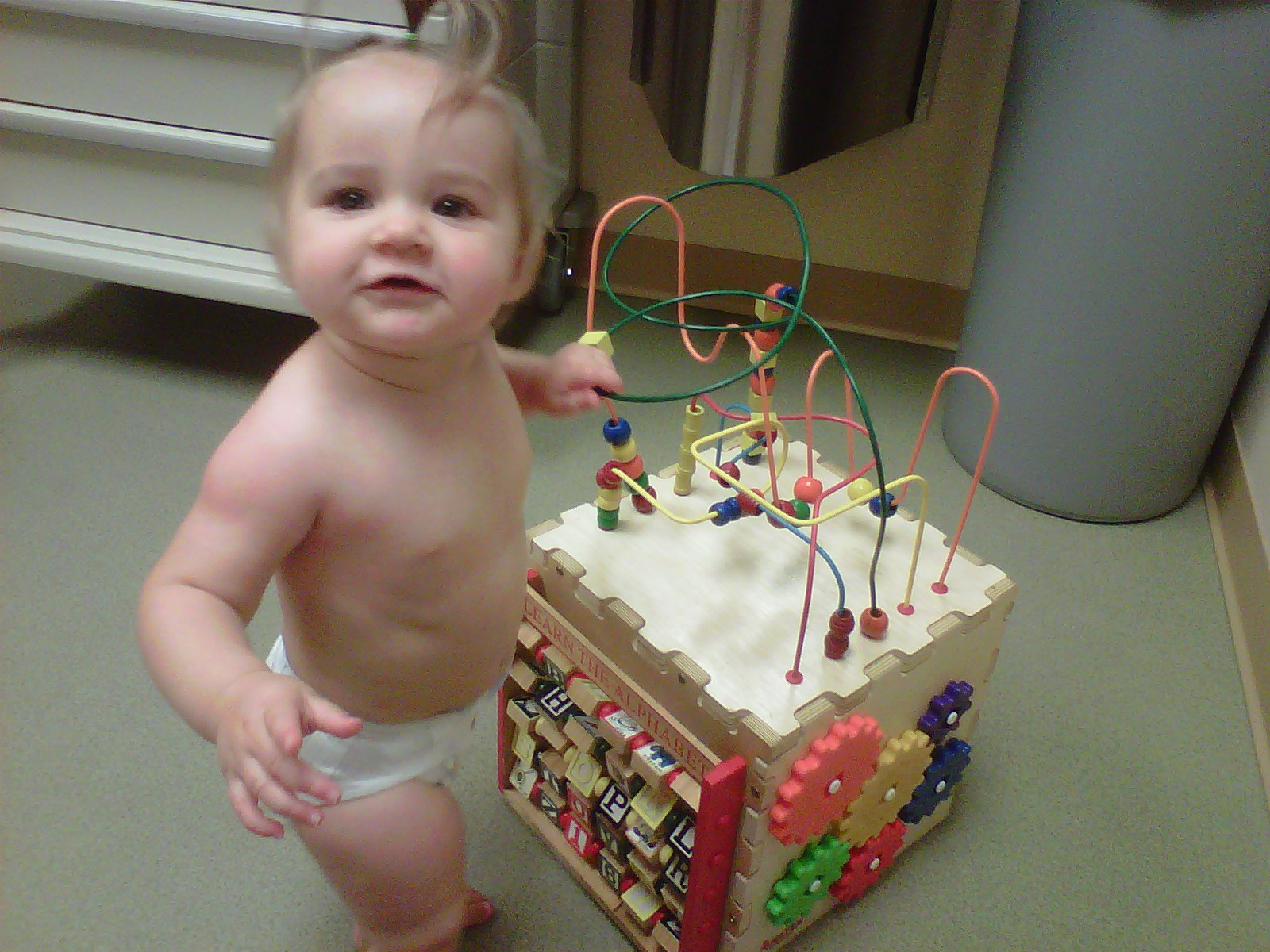 She was a happy girl playing in her diaper…until she had three shots after I took these pictures. The nurses brought her a little duck toy to give her which ended her tears and she said “duck”!