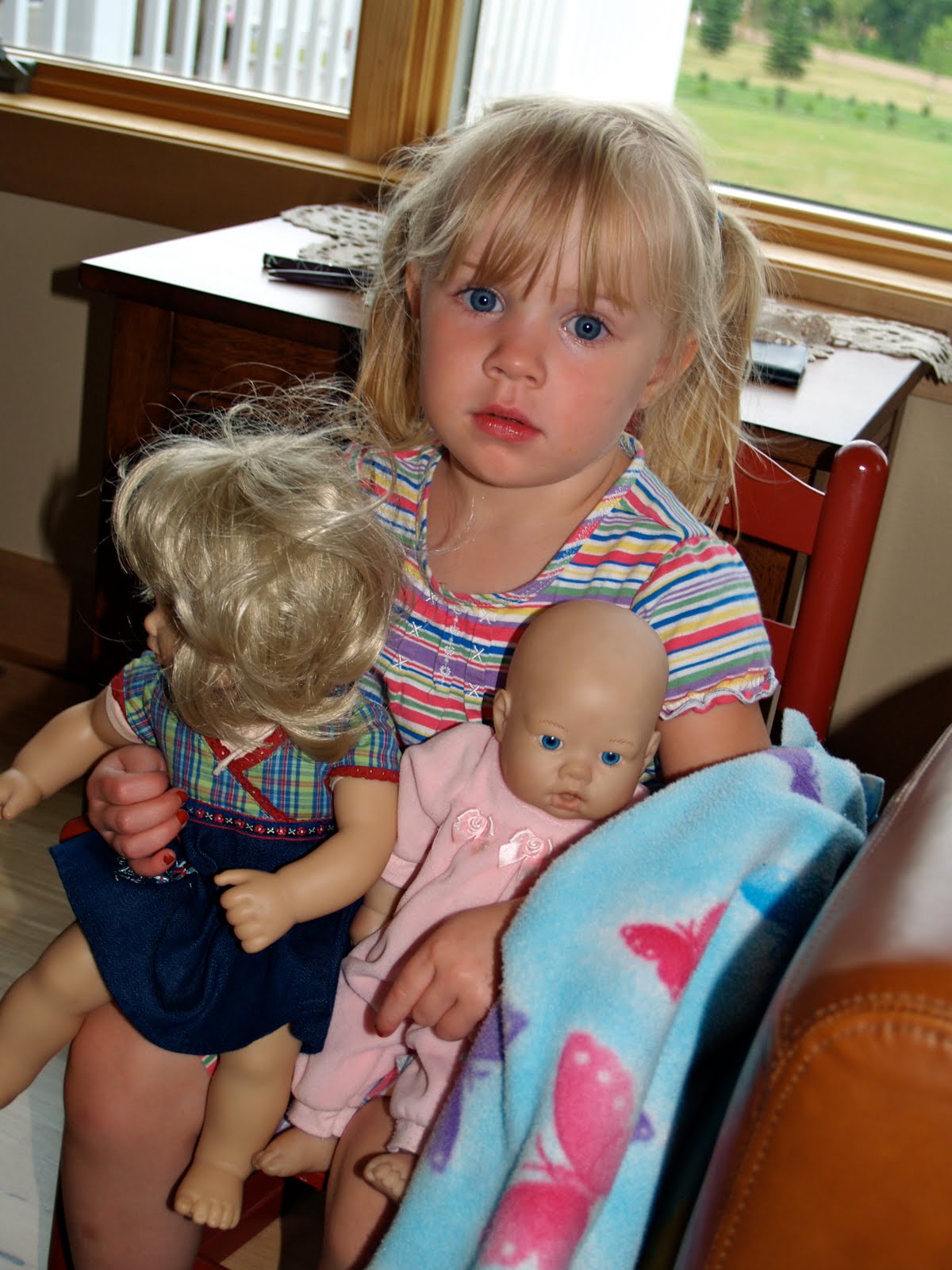 Anika is in full tears on this picture as E explains all the reasons why her sister cannot play with her babies. They were sleeping. Anika was waking them.