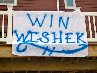 Hunter jumped right back into working today at the lumber yard with Nathan after being a ball boy at numerous games on Saturday and Sunday. He had today off from his ball boy duties but will back at it tomorrow morning as our home team is in the championship. It is very rare for a host team to even win a game in a state tournament. Our team has had a tough time getting by Lisbon to win our district championship and again this year were the runner up team. This time as the host team, our local boys automatically had a berth in the state tournament. They knocked off a few teams and tomorrow morning it will be another district rivalry match up but this time for a state championship. Hunter will be working as a ball boy and I’ll be standing behind my newest sign hanging from our deck.