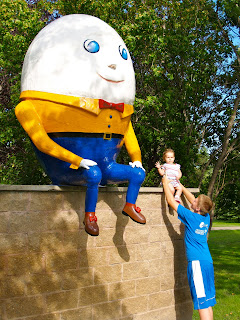 Humpty Dumpty was sitting on the wall. He had not taken a great fall so Anika joined him with the help of her big brother.