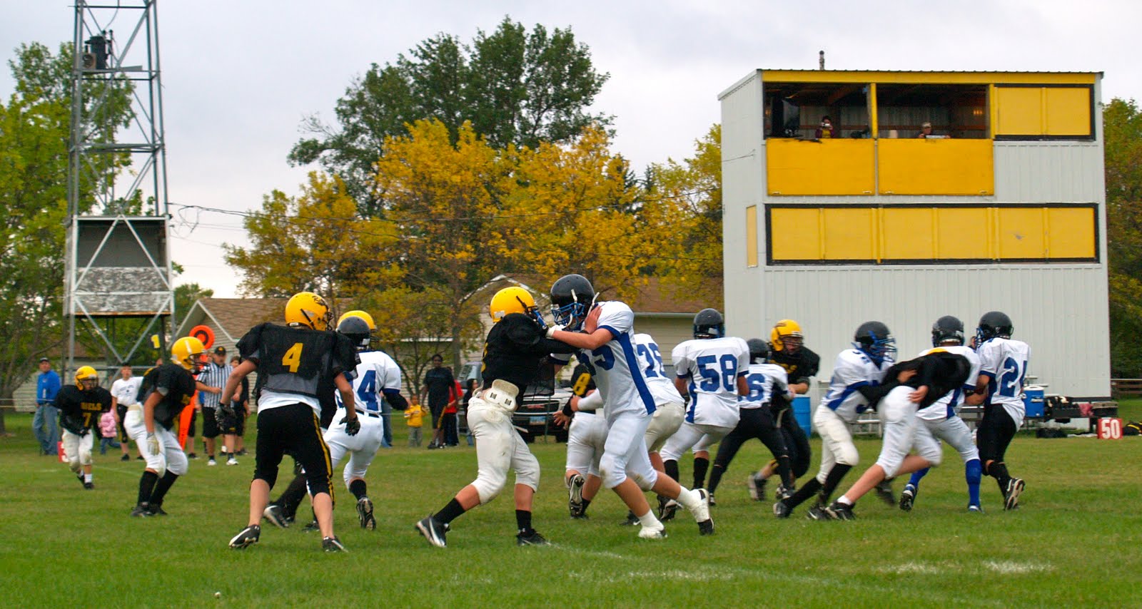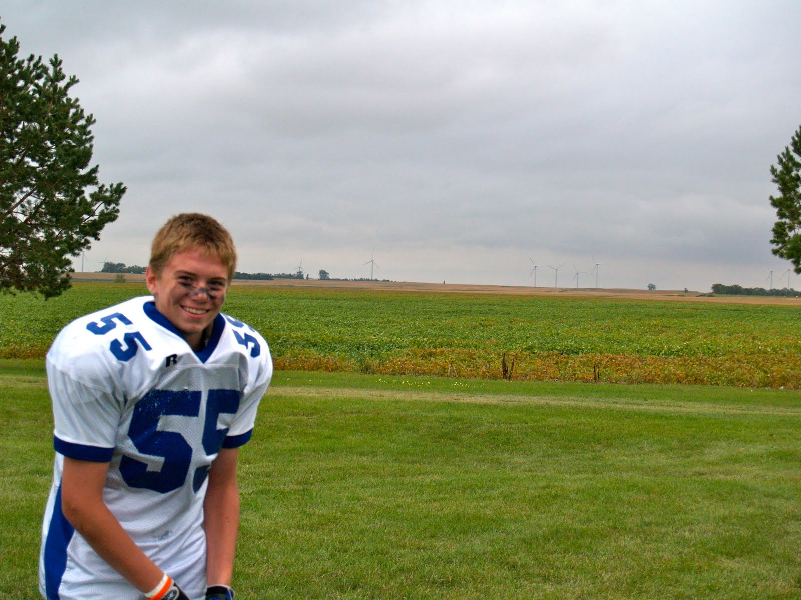 To give you a better understanding of just where football on the prairie takes place, the backdrop to our weekly games, above is Hunter turned opposite of the football field. The prairie landscape includes a football field backed up to a soybean field with wind towers on the horizon.