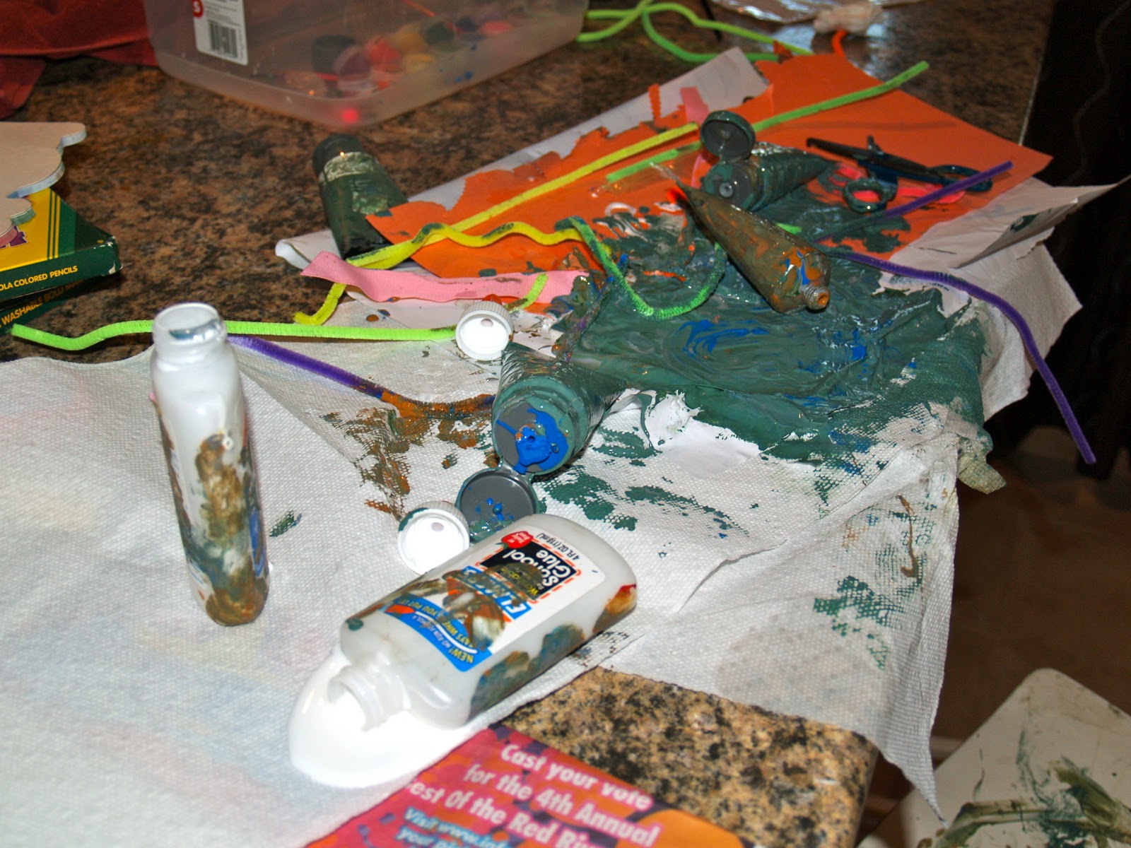 Miss E had dug out a plastic storage bin that I keep acrylic paints in and we have previously used them for Hunter’s school projects. They were off limits for Miss E. But she found them necessary for her project and told us post-painting the paint “yeaked (leaked)” and so did the glue.