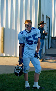 Pointing at the sun, this week he wanted to make sure you all knew that he indeed needs that tough black paint on his face because it is sunny (and was 75 degrees at game time last night!) or as we refer to it on the prairie, Indian Summer, at least for a few days. The black paint is needed not just to look cool and tough but indeed to keep the warm, bright sun out of his blue eyes.