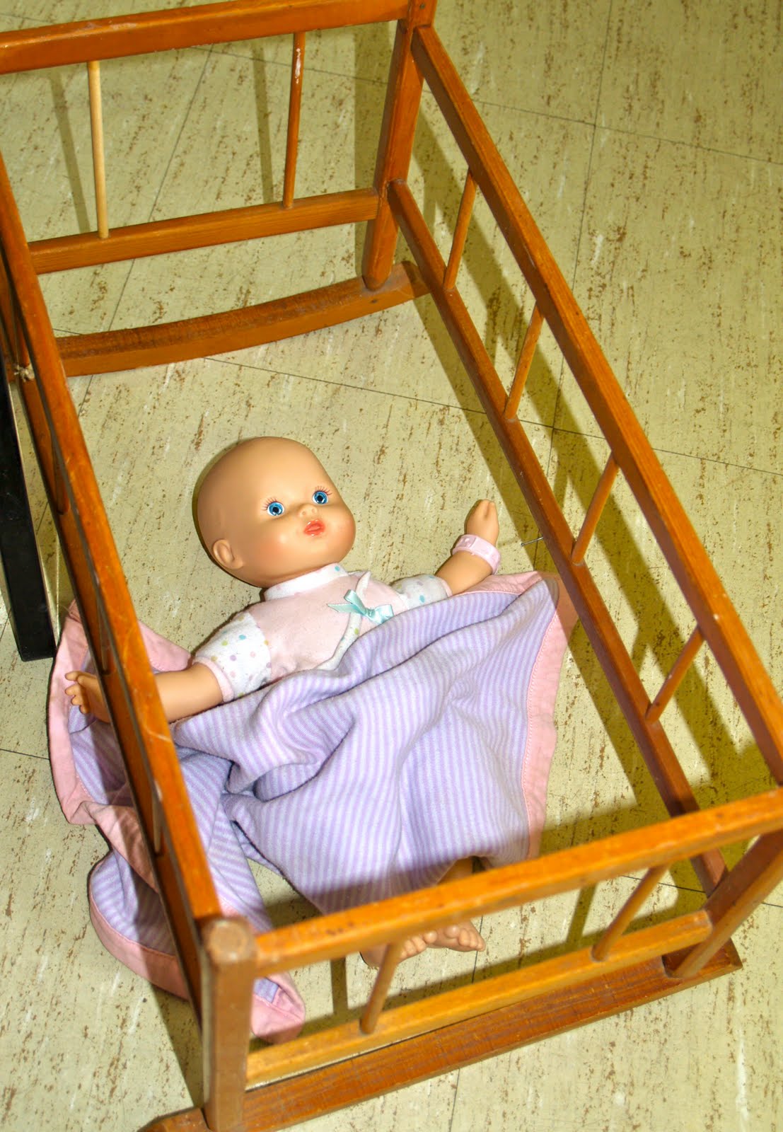 E, of course had a baby doll along with her and quickly found a home for it. She wanted this baby crib and said her daddy could fix it.