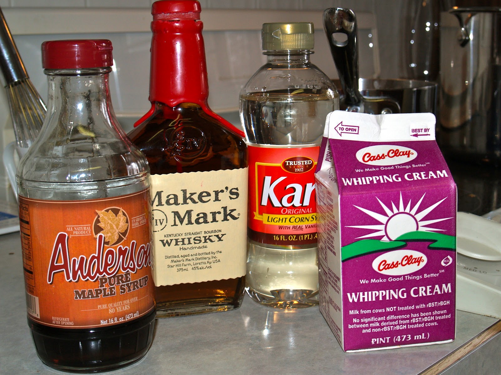 Heavy Cream, Pure Maple Syrup, Light Corn Syrup and Whiskey….specifically I suppose you call it Kentucky Bourbon.
