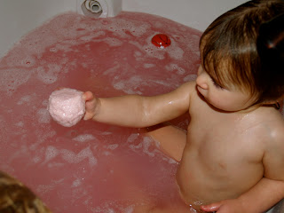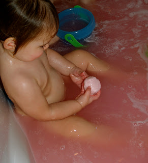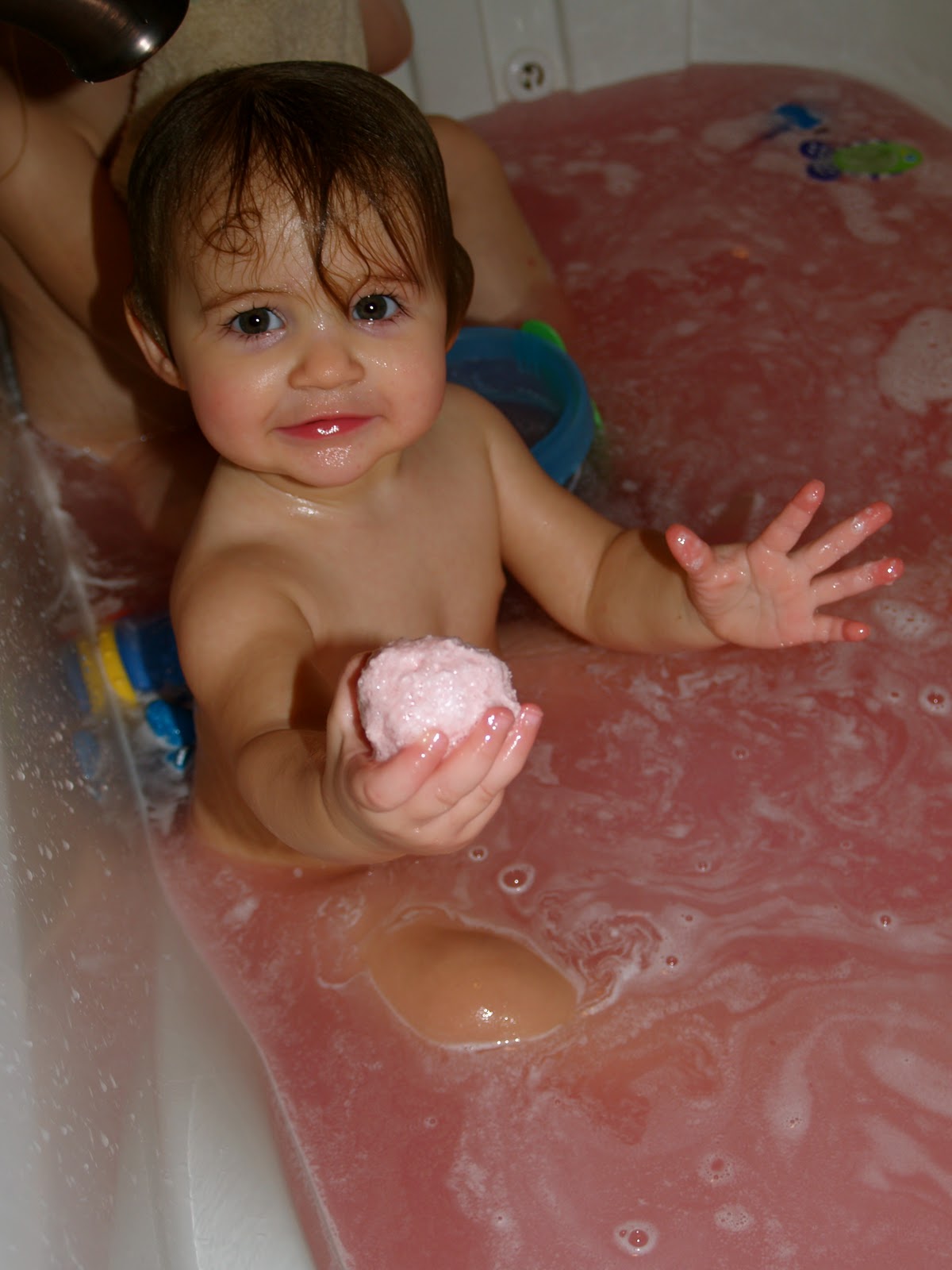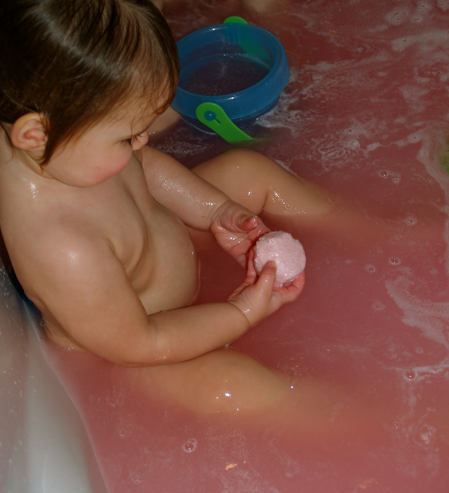 In a side by side test, we have determined my mom’s homemade bath bombs fizz more than the expensive Lush brand bath bombs. The Lush bath bomb we tested did turn the bath water very pink but the more fun, longer lasting fizzy bath bomb was definitely the homemade by my mom bath bomb that Anika is holding in these pictures.