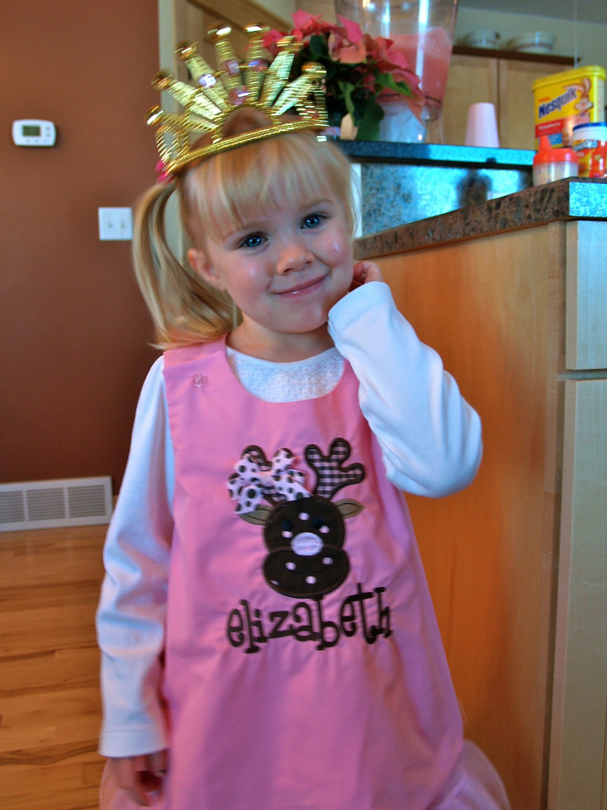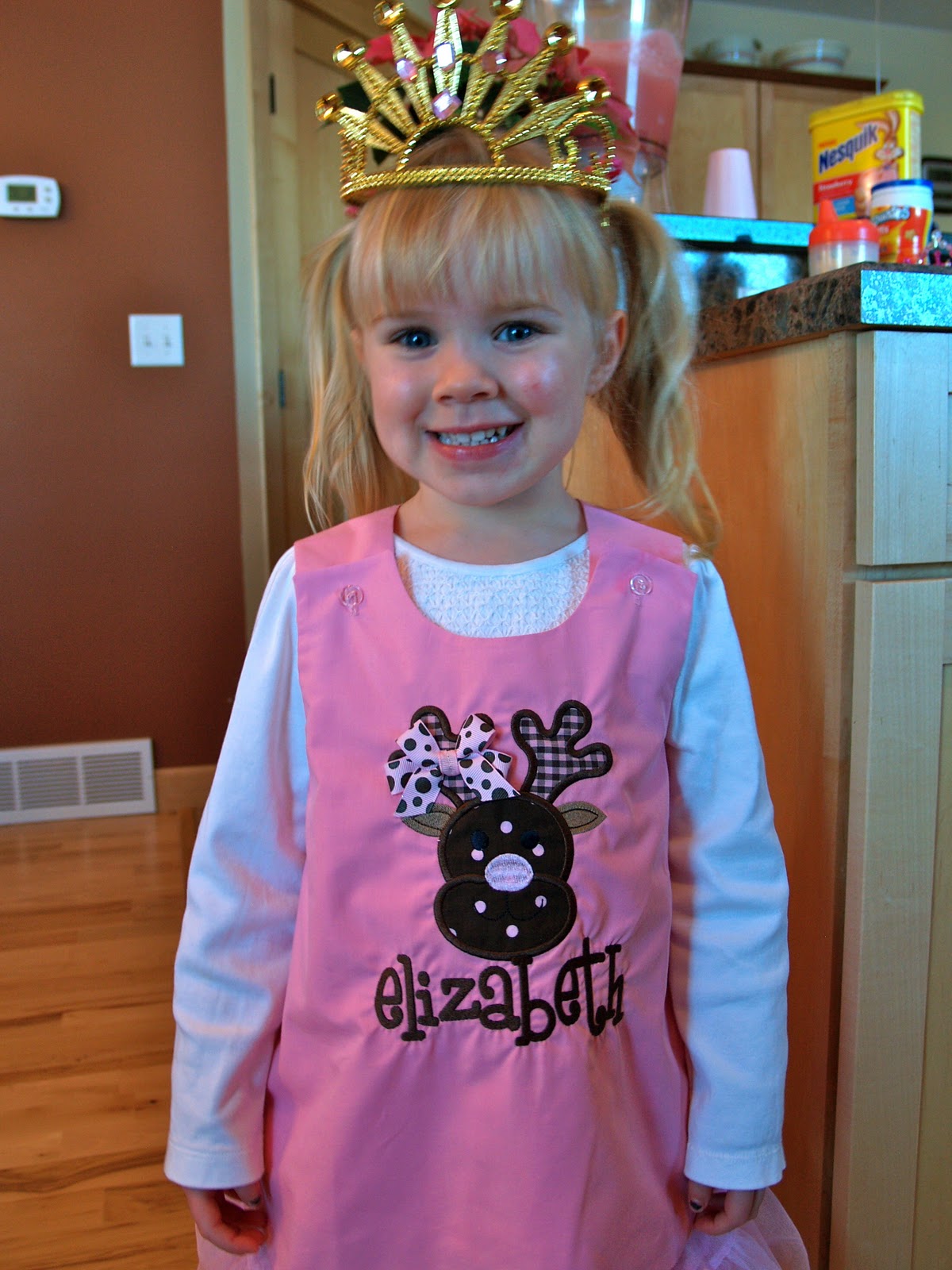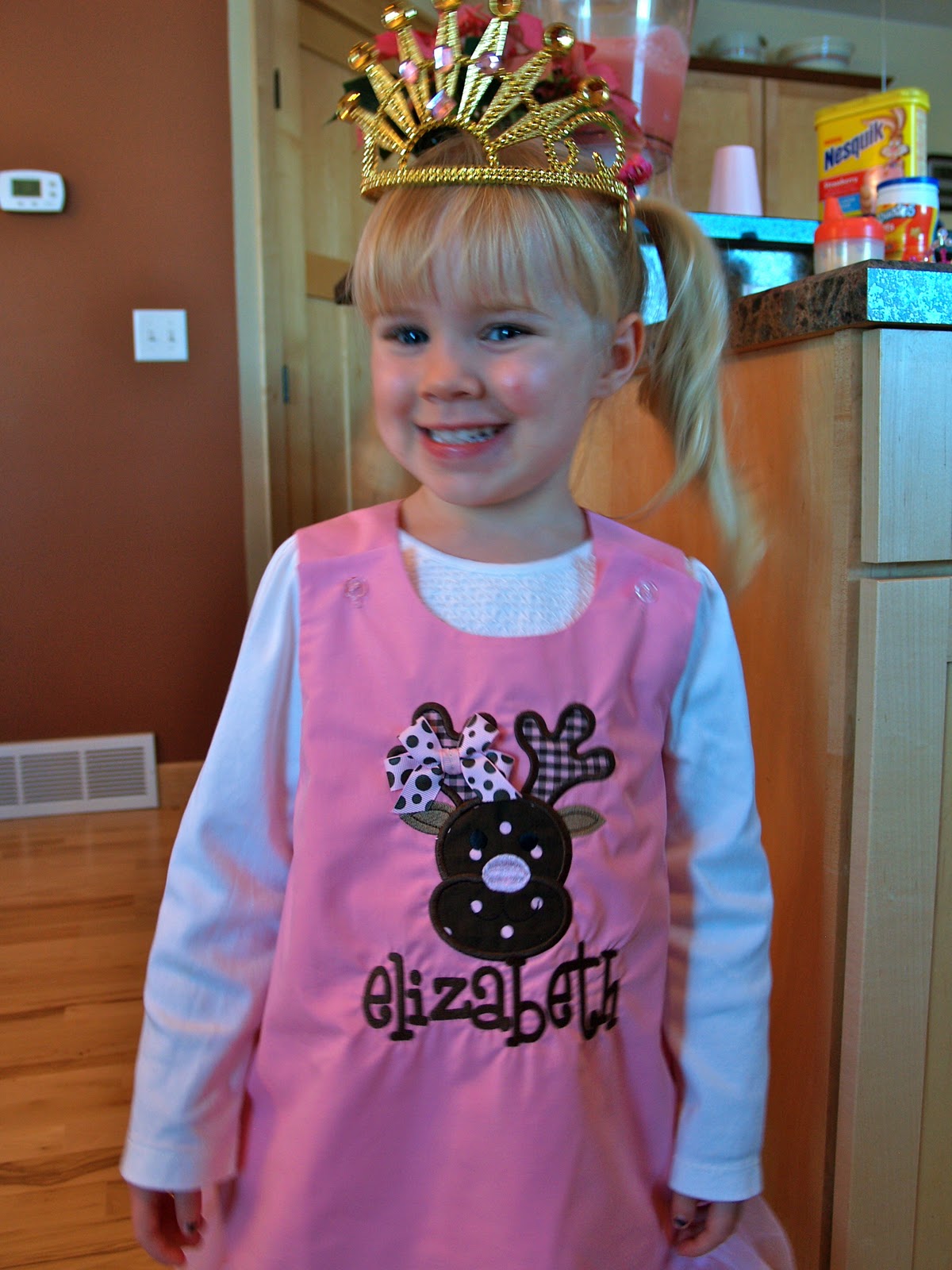 Today she is wearing her “E-YIZA-BEF” pink reindeer out fit to Lori’s daycare with Pinkalicious cupcakes that she and I made as snacks for all the kids.