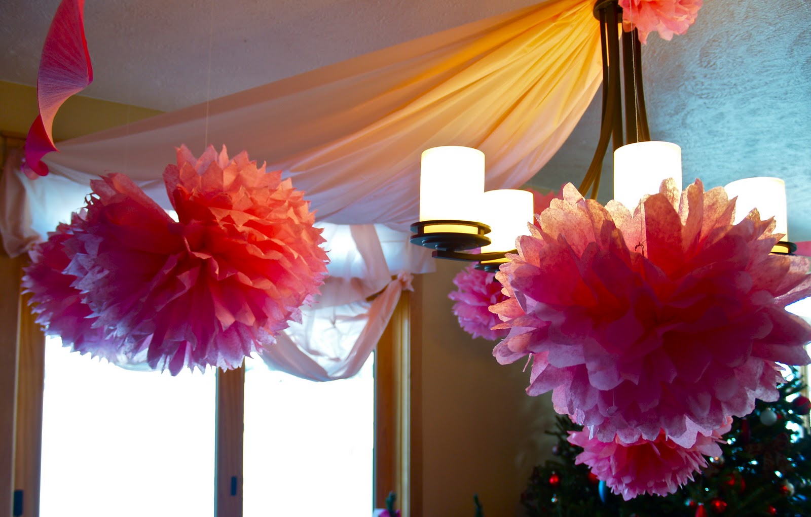 I couldn’t bring myself to toss those beautiful tissue balls today. Instead they are finding a temporary home to hang from the ceiling in Miss E’s pink bedroom.
