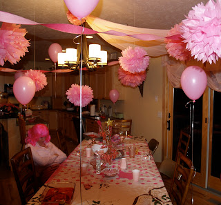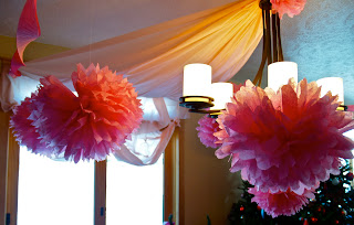Kirsti had pink tissue paper left over from her (pink) spring wedding and made fabulous tissue balls, an idea she got from Martha Stewart. I am always impressed when a person can actually take one of Martha’s idea and put it to good use. The only thing I have successfully done of Martha’s is to make her cheese balls for parties. And I’ll never be able to make tissue balls.