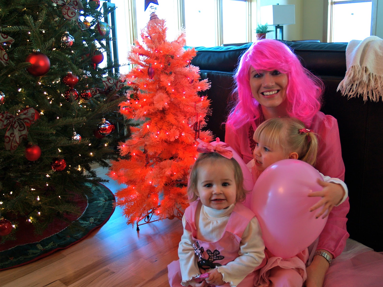 Miss E’s request and idea was for everyone to wear pink. Kirsti took this to a whole new level by ordering she and me pink wigs. Santa Claus brought Miss E a pink Christmas tree last year so that was a part of the decor.