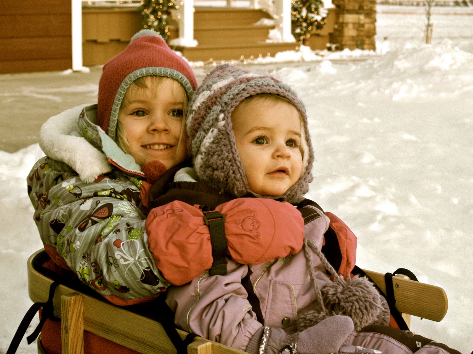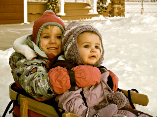 Instead of getting pulled in the wagon, pushed in the double stroller or pulled in the bike cart, the girls still get their outdoor strolls in via the sled.