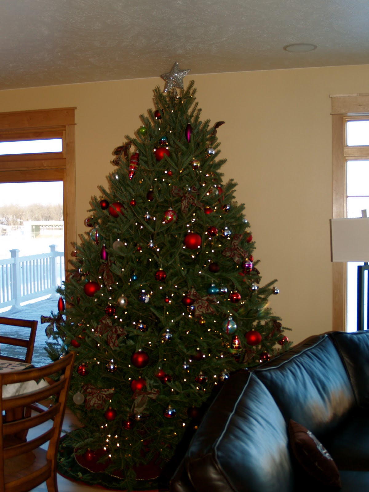 We have four Christmas trees. The above fresh tree is our largest, measuring about nine feet in height and six feet wide…literally.