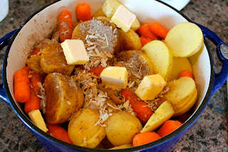 In a Dutch oven, I sliced up another onion, sliced up more potatoes, added more carrots, another packet of Lipton Onion Soup mix and a few tablespoons of butter.