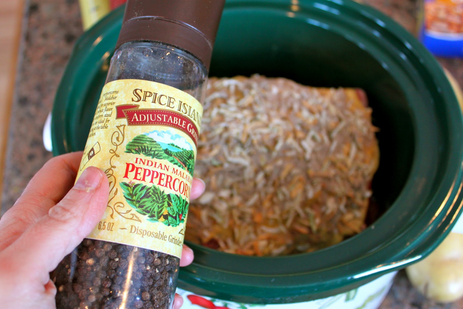 Place the beef roast into the Crock-Pot or dutch oven. Cover with 3 TBSP. dijon mustard. I lathered it up with additional mustard and also used a spicy ground mustard.