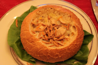 Leeks, onion, carrots, mushrooms, butter, flour, salt, pepper, chicken broth, sherry, cream, chicken breast, cream style corn, wild rice and silvered almonds all served in a bowl or a fancy bread bowl.
