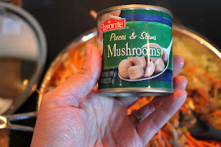Add one can of chopped canned mushrooms or 1/2 cup of fresh sliced mushrooms to the vegetable mixture in the frying pan. Stirring occasionally and continue to simmer on low.