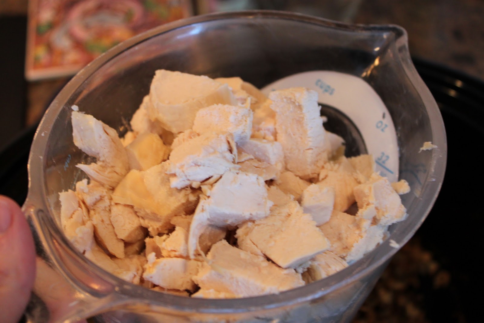 Add 4 cups of chopped skinless, boneless chicken to your slow cooker. I bake chicken breasts ahead of time and then just chop them for this soup. Or you can use some left over chicken or canned chicken breast.
