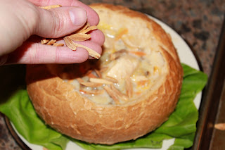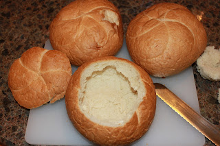 I picked up these fancy bread bowls off the prairie. I suppose I could learn to bake them if I baked bread but I thought would be fun way to serve the soup. It was a huge success. The bread soaked up the soup a bit and was fabulous to pull a part and eat after the soup was gone.